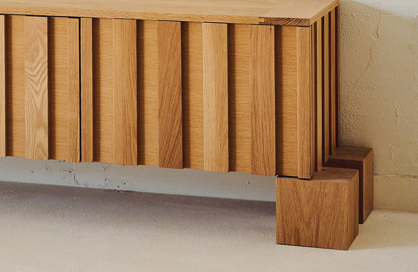inspired by the structural design of forts sarah made as a child, the fort credenza is a mighty 8' of storage floating on 7" blocks. available in oak, walnut, or ebonized oak.