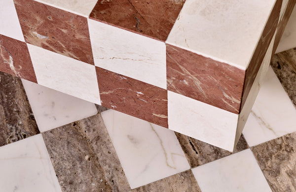 taking the idea of a monolithic table and turning it on its head with the use of juxtaposed stones fused in a seamless checkerboard pattern, our gambit coffee tables blend a post-modern form with classic materials. the result is an unexpected statement piece that fits within a variety of styles and will anchor the room. available in three sizes and in any two of our four stone options: rossa, crema, viola, and verde. customization of stones is also available. this piece is handcrafted in western, mi.