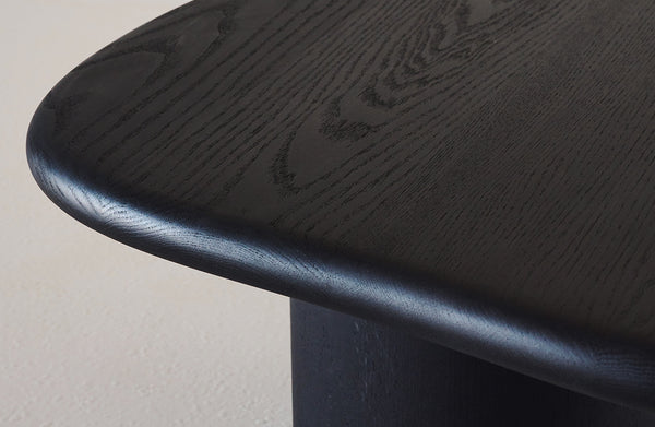 a nod to the smooth stones found on lake michigan beach walks, skimming stones are a collection of organic shaped tables that can be nested together or treated as coffee and side tables. a thick bullnose top evokes the edge of a tumbled smooth stone, while a cylindrical base anchors the piece. available in oak, walnut, or ebonized oak.