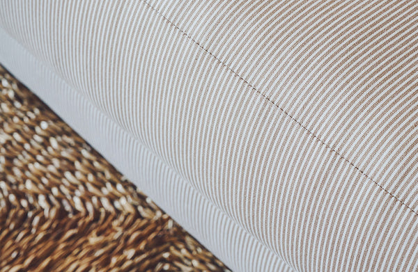 this vintage tessellated corner sectional has been reupholstered with a streamlined striped duck cotton canvas. the fully upholstered base and arms give a tailored look while the extra deep seat and throw pillows make it perfect for lounging.